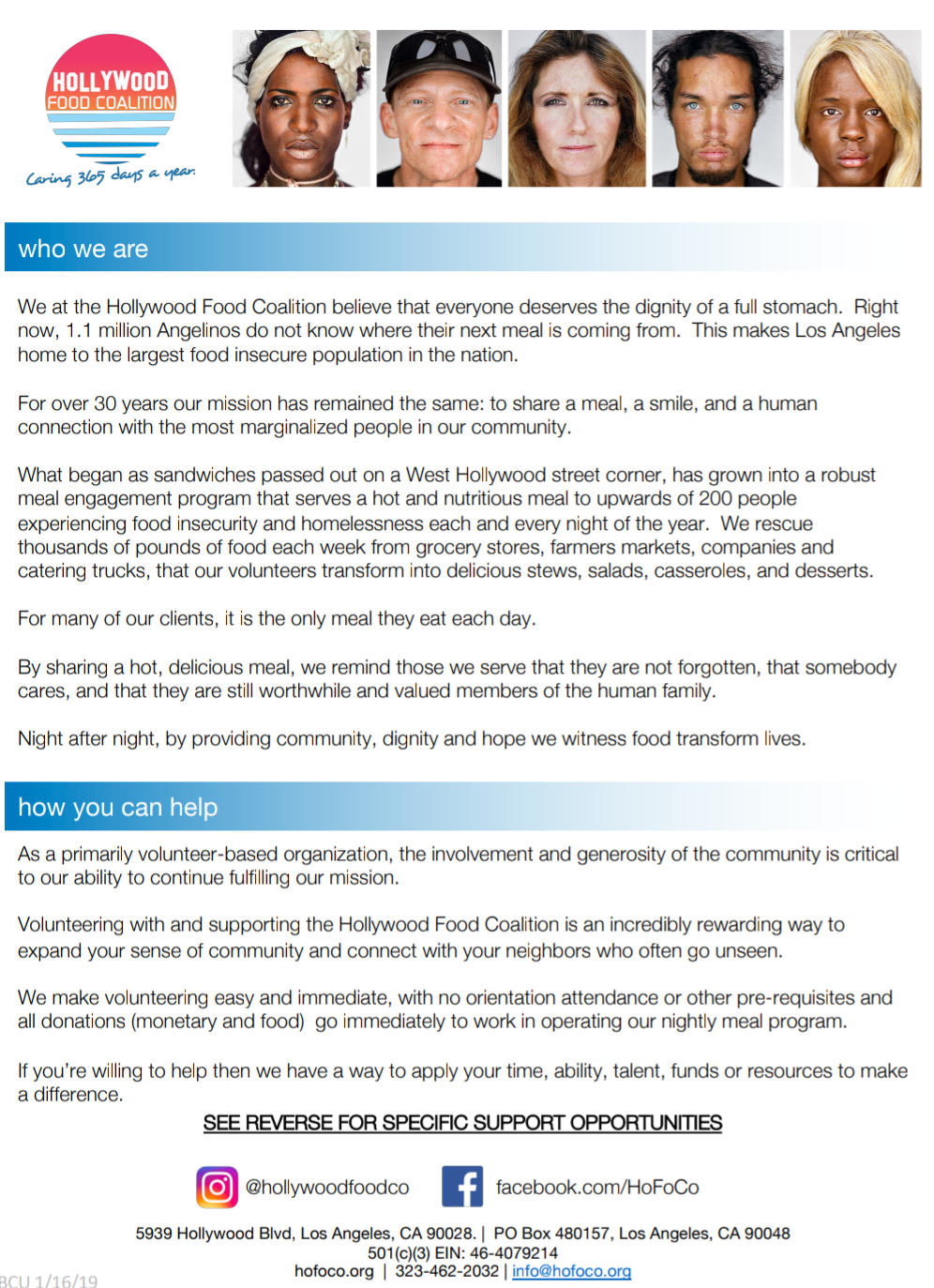Gratefully accepting clothing, blankets, hygiene supplies, and non perishable food for distribution by Hollywood Food Coalition
